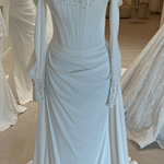 Découvrez une robe de mariée au style élégant et moderne, conçue en crêpe premium pour offrir un tombé fluide et une silhouette parfaitement structurée.