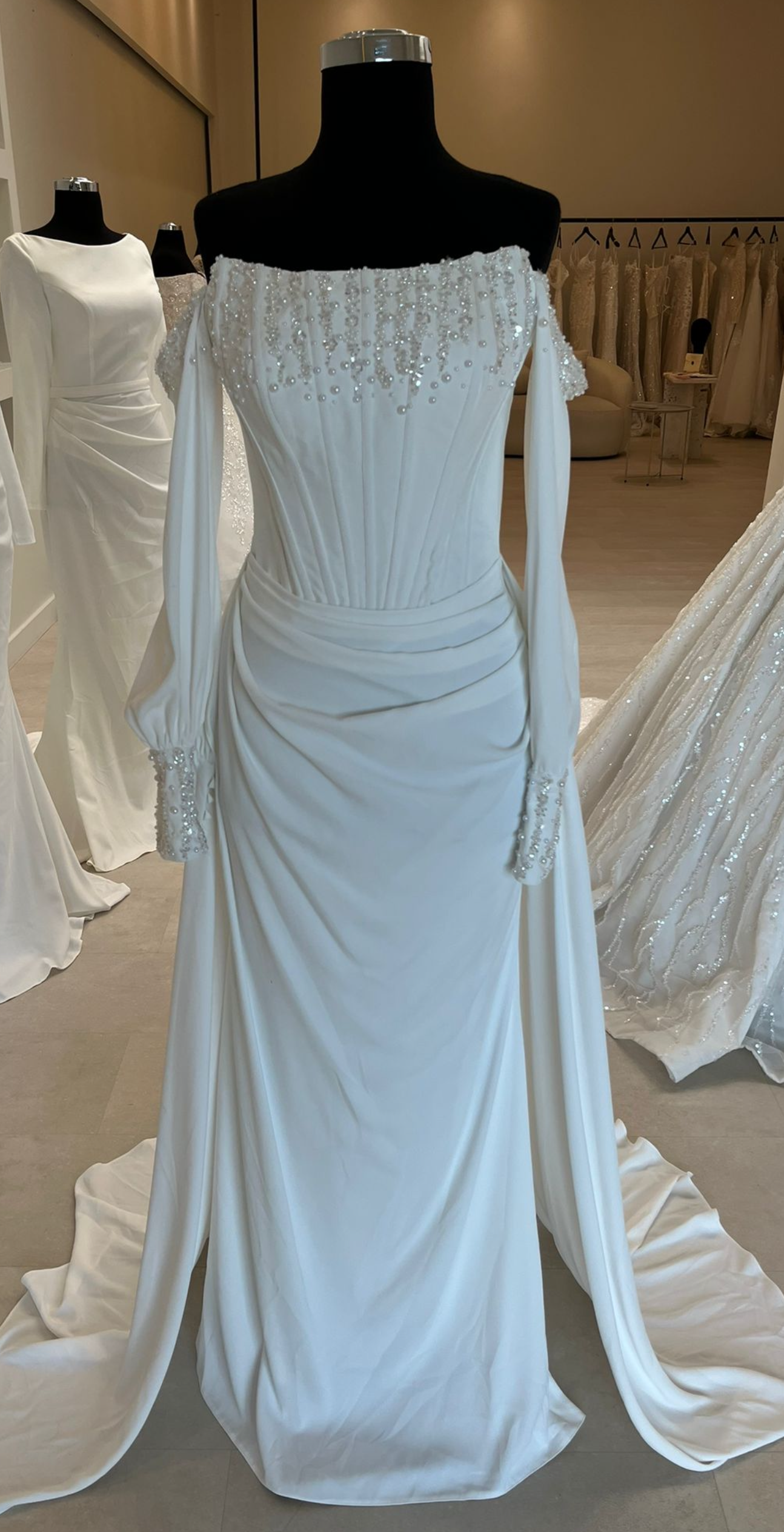 - Décolleté off-shoulder orné de perles cousues à la main